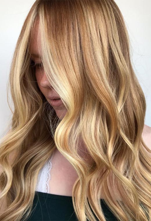 Questa cascata di onde biondo fragola dorate è davvero irresistibile! Questo look combina le tecniche ombre e balayage per creare un magnifico, aspetto lucido che appare molto complesso. Le radici e i medi sono naturalmente di un caldo marrone ramato, che ben si abbina a questo caldo, prendere d'oro i capelli biondo fragola.