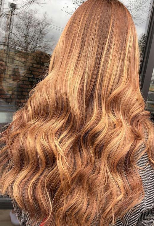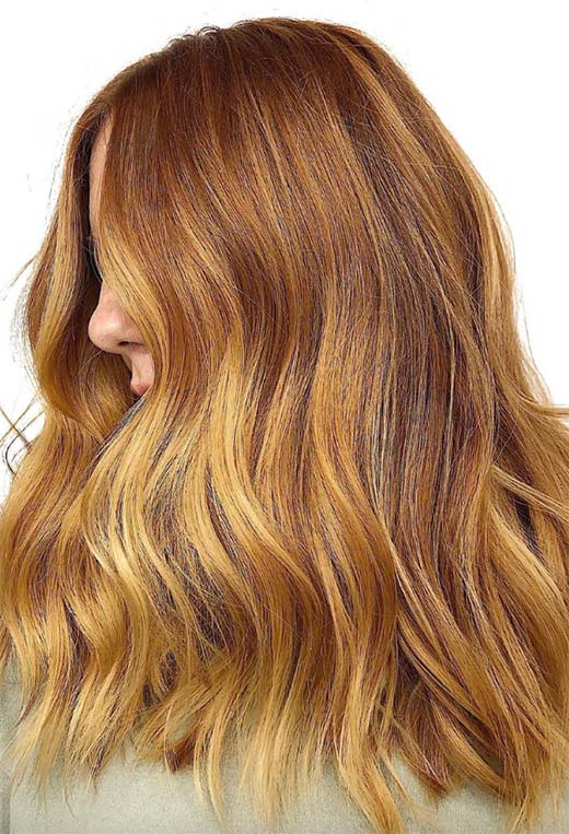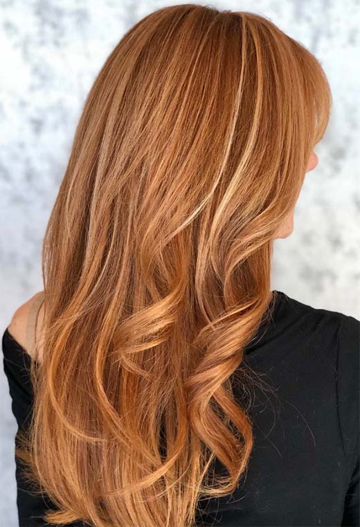 Another way of achieving this kind of look is to bleach the hair in a balayage and then overlay a reddish tint over the entire head – the natural hair color will look more copper or auburn, while the streaks will turn strawberry blonde.