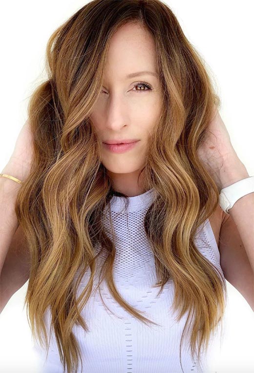 Ciò che ci colpisce davvero in questo look è il contrasto tra le fredde radici di mogano e i caldi medi di rame, quale, Certo, diventa un biondo fragola leggermente più neutro alle estremità. Questo è un contrasto molto allegro, grazie allo stile ondulato.