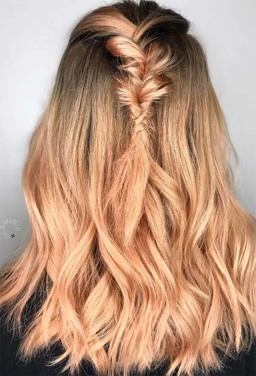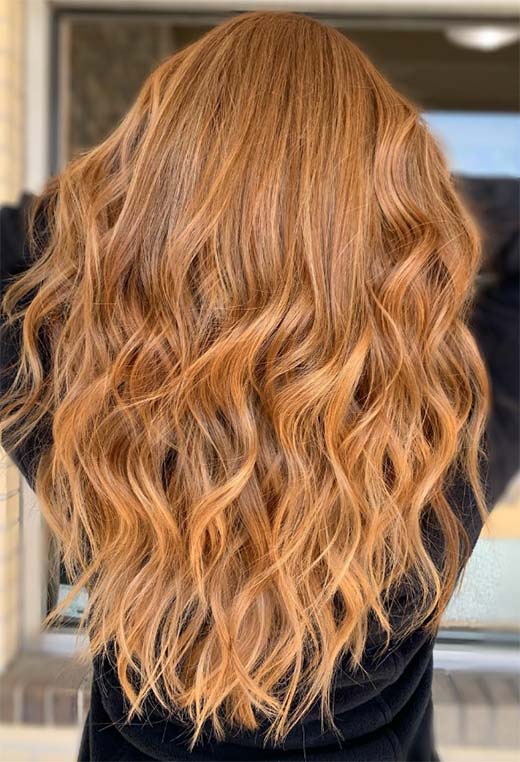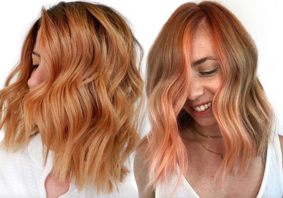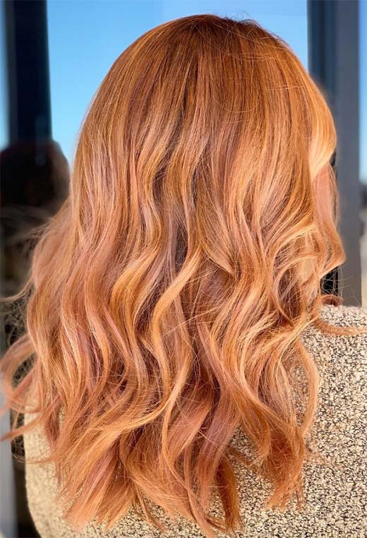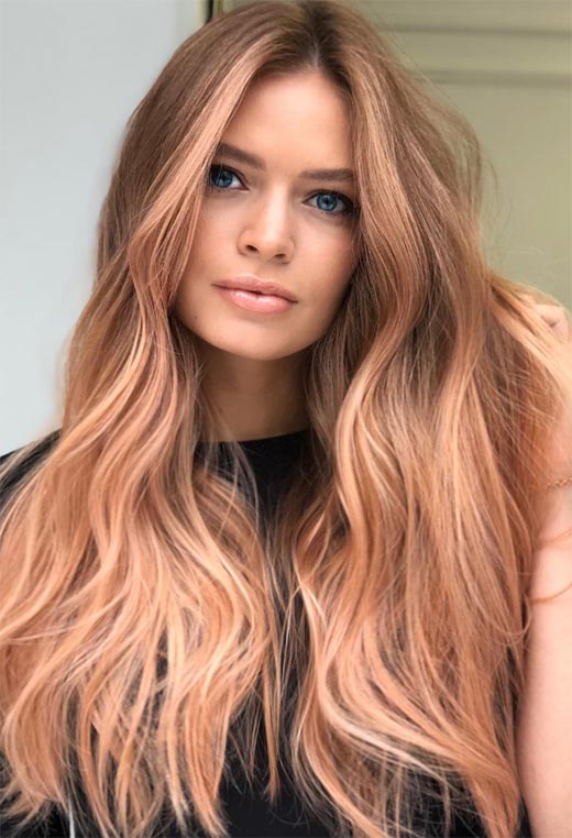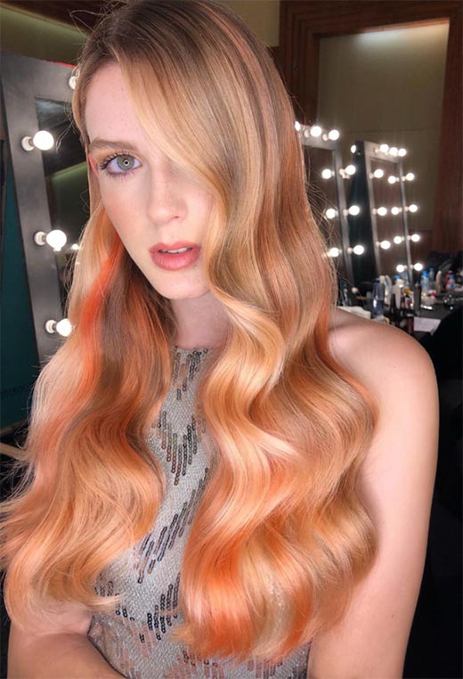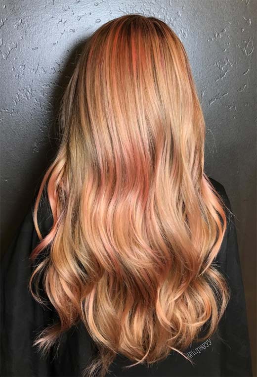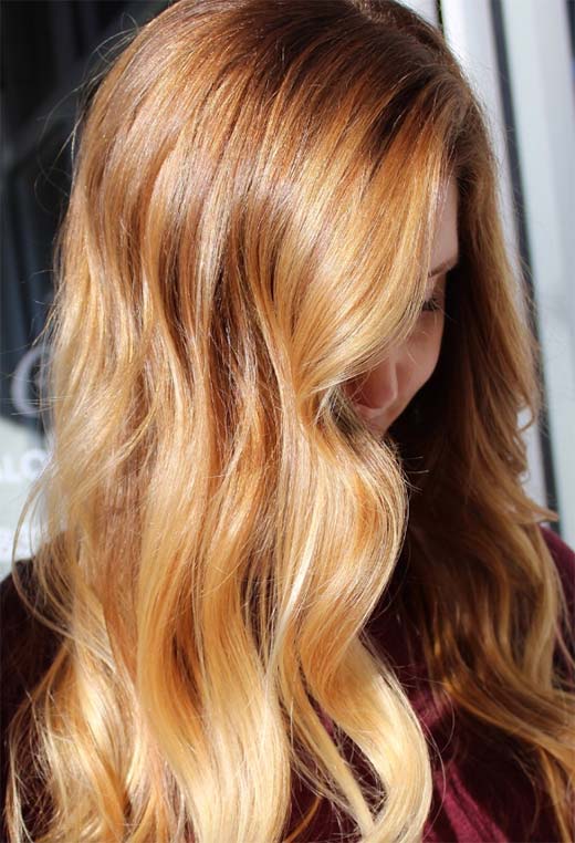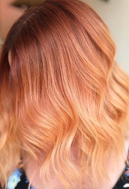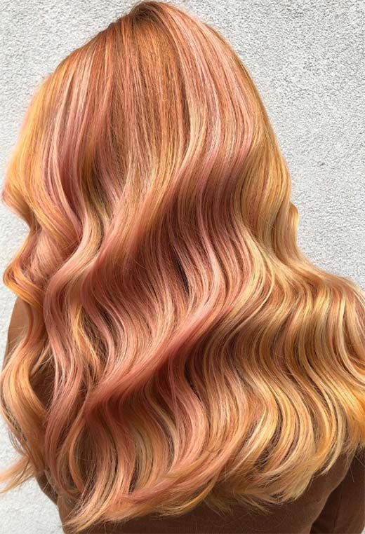 Questo colore di capelli fa venire in mente parole come romanticismo, estate, luce del sole, e fiori. È una versione innovativa della bionda fragola con radici ramate che si trasformano in un tono più rosato a metà e poi fanno il drastico passaggio a molto caldo, toni biondo dorato alle estremità.