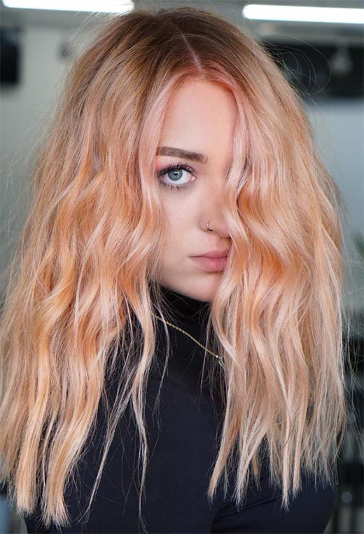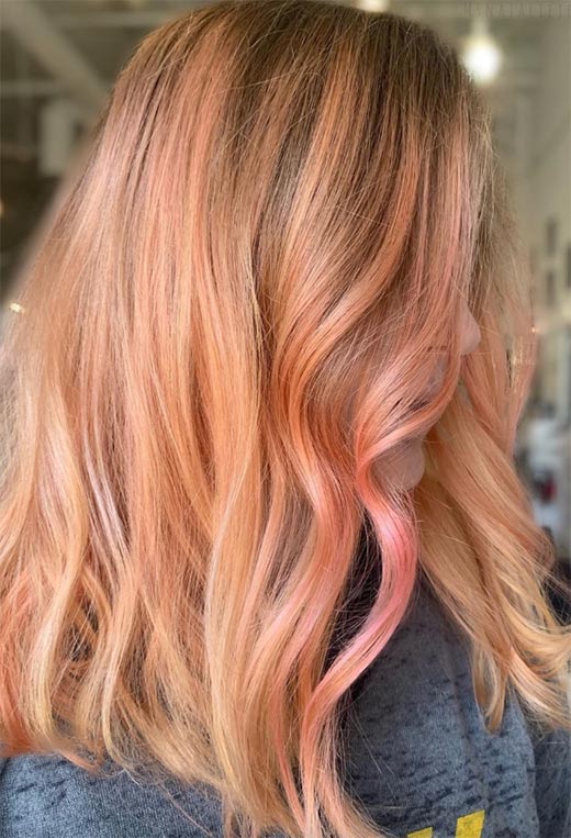 Se quello che vuoi veramente è che i tuoi capelli sembrino una gemma preziosa color pesca, porta questa foto al tuo colorista. Il graduale passaggio dalle radici dai toni freddi ai medi e alle estremità biondo fragola ci ricorda davvero il modo in cui il colore cambia in un opale pesca mentre riflette la luce.