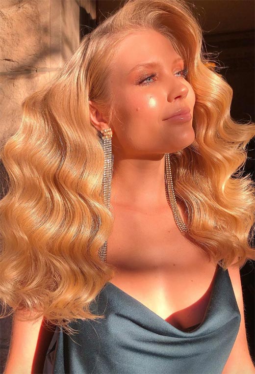 Screziato di sole e lucente, queste onde bionde alla fragola sono da morire! I capelli erano tinti in modo abbastanza uniforme, ma le radici sono state mantenute un po' più scure, mentre l'effetto ultra glamour deriva da ricci unidirezionali che sono stati poi spazzolati e stuzzicati alla perfezione voluminosa.
