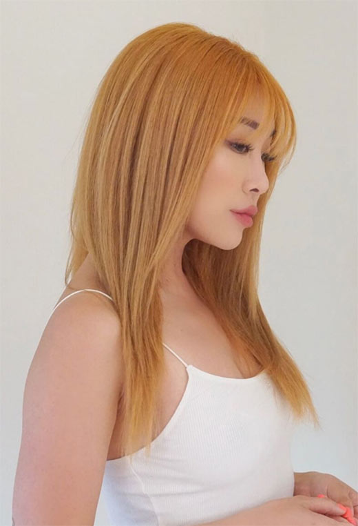 Caldo potrebbe essere un eufemismo in questo caso, perché questa bionda fragola tendente all'arancia è davvero bollente! La frangia a pezzi e le estremità rasate danno un tocco in più a questo aspetto altrimenti dolce, con molteplici sfumature di calda fragola che creano molta consistenza.