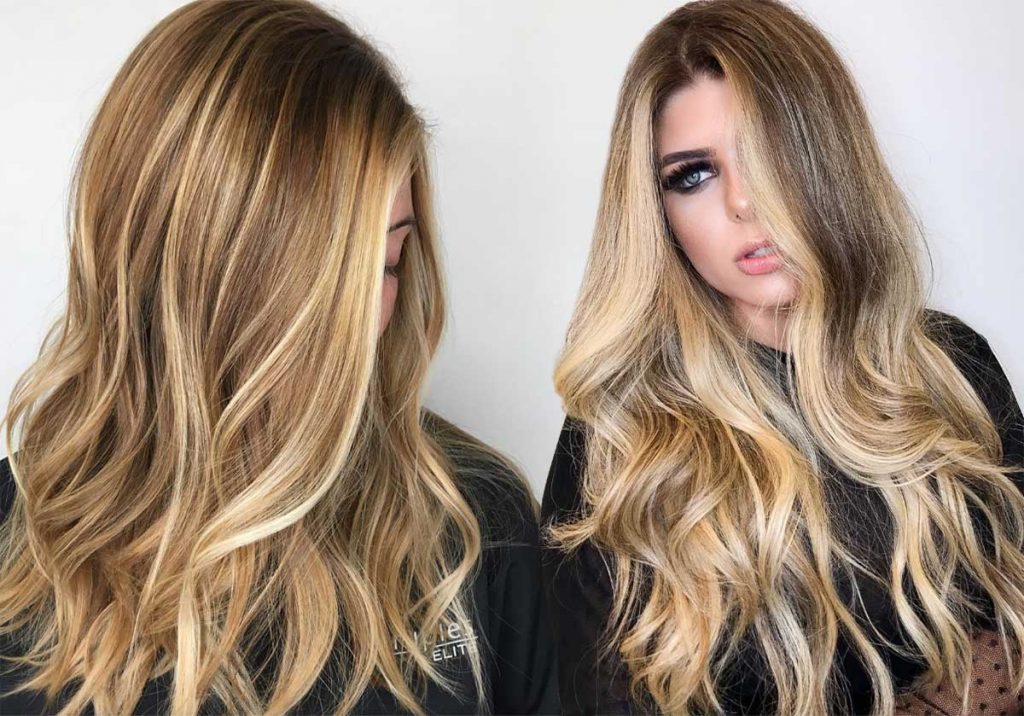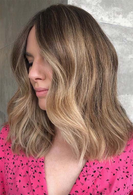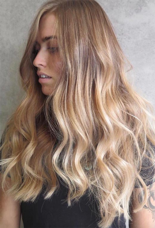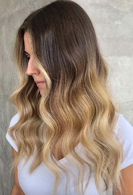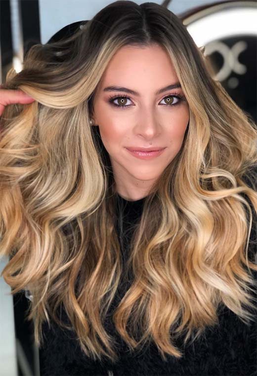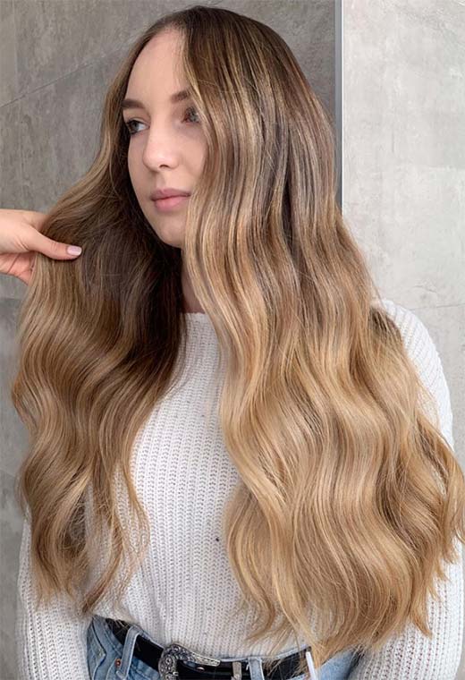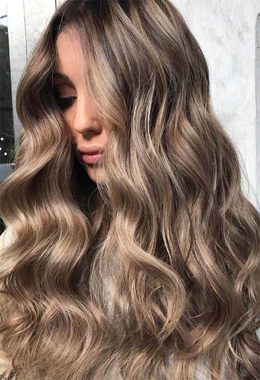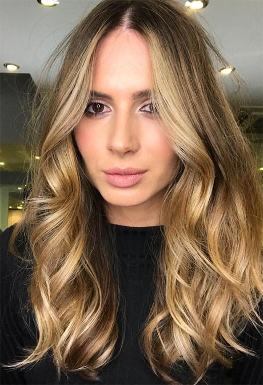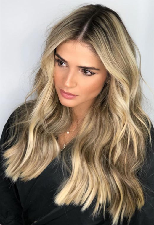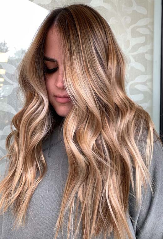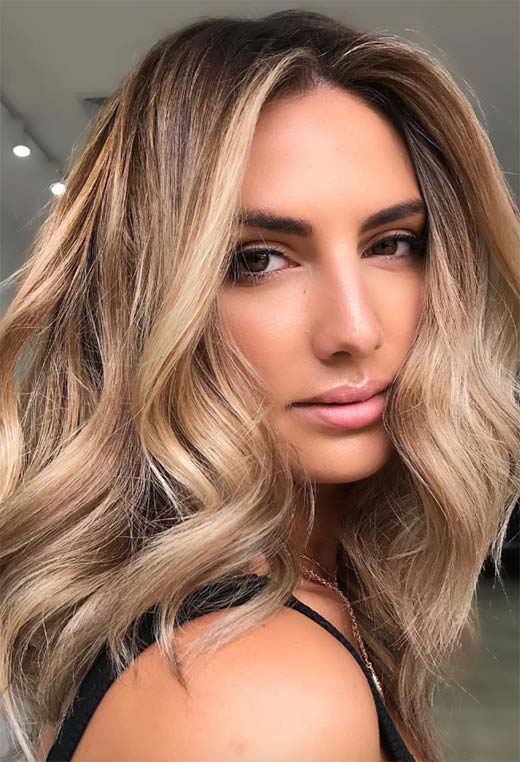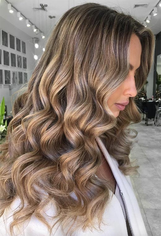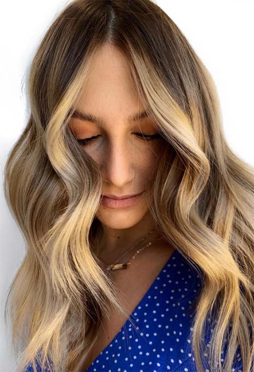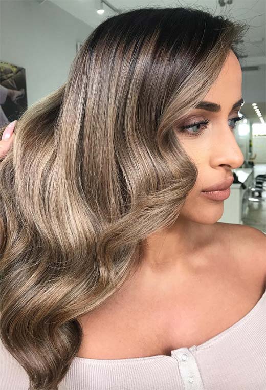 Dark blonde hair can be ultra-glamorous, especially if you have long tresses and are not afraid of spending a bit of time blow-drying your hair into wavy perfection. This look relies on a multi-tone balayage technique that gives so much depth you could fall right in.