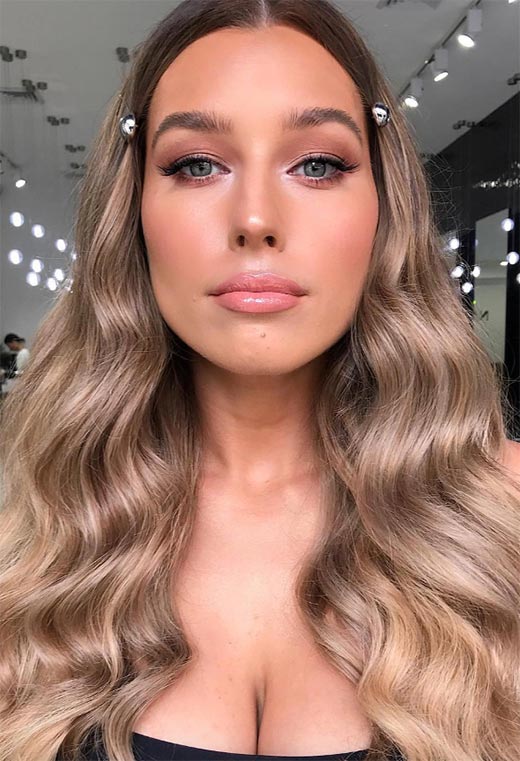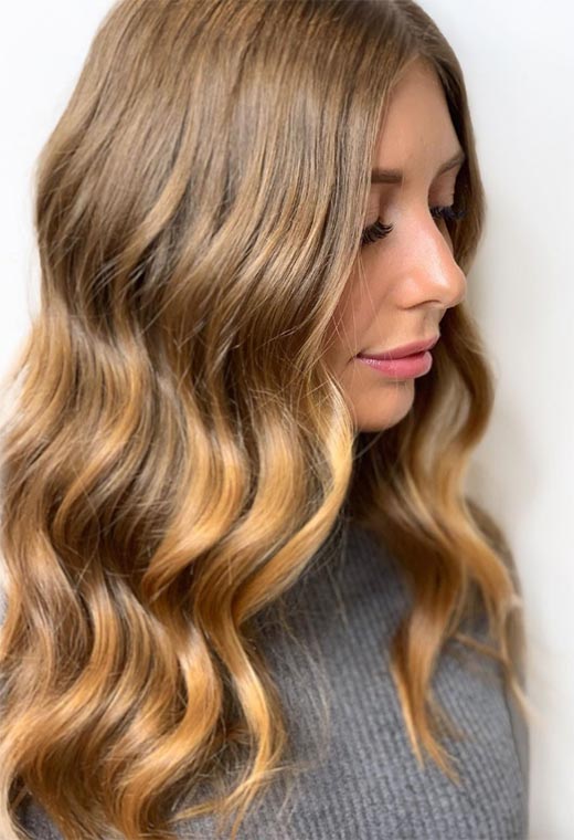 The secret to melted gold effect of these stunning warm dark blonde waves is simple – it’s all about the health of the hair! Hair oil and a lot of moisture are a must to get freshly dyed hair to emanate so much gleam.