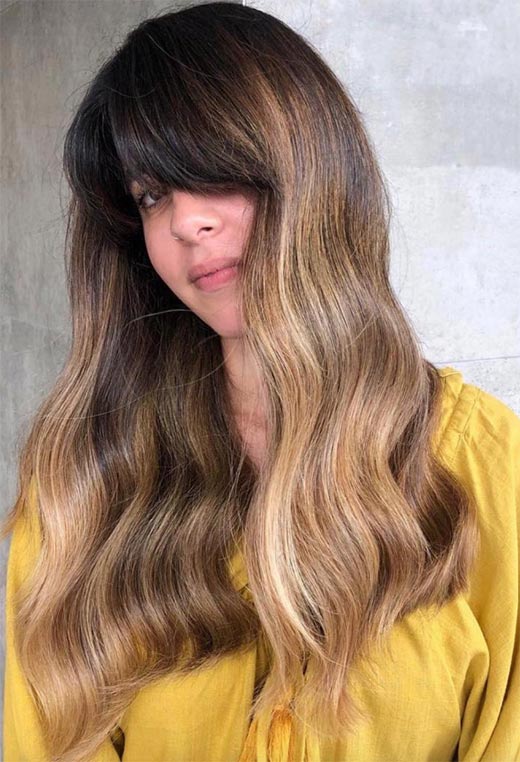 This dark blonde hair color is applied in a heavy, intense balayage that is quite dramatic, though a few dark lowlights add depth and work nicely with the choppiness of the cut. The razoring technique for the ends and bangs takes some weight off the long tresses and gives an edgy and modern vibe.