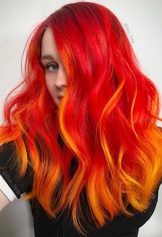 Puoi sempre fidarti di un colorista professionista per creare un look complesso, vivido, e assolutamente strabiliante. Questo sguardo infuocato fa venire in mente una Fenice rigenerante, ardente di fiamme giallo-arancio, rosso-arancio, e magenta che sono stati creati attraverso la tintura intelligente di ciocche di capelli a strati.