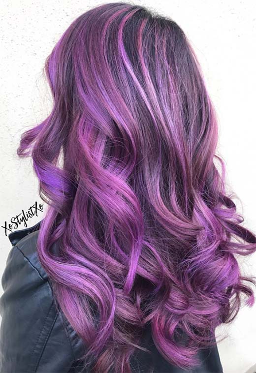 If you can’t choose just one shade – don’t! Violet, amethyst, periwinkle – bring them all into the mix. The key to this purple hair color is plump and fluffy hair. Playful waves create a casual feel that will take this look from day to night.