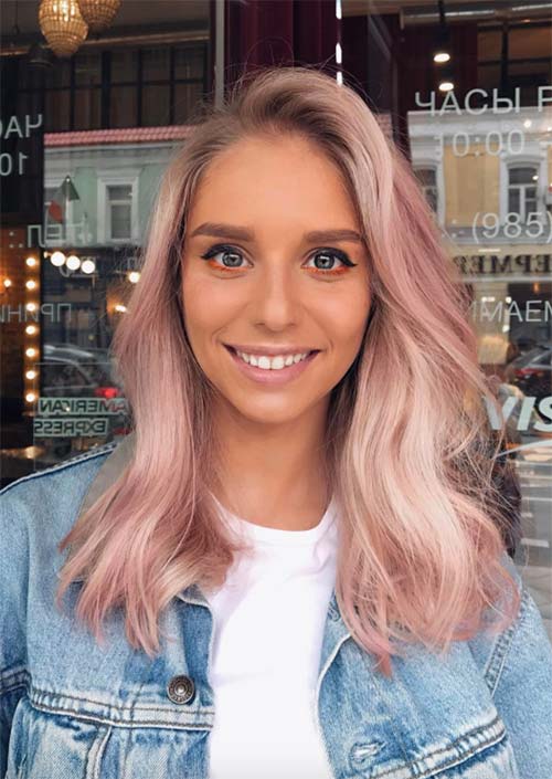 The unexpected mixture of spring hair colors is strategic when melted into a soft balayage. A medium brown root rounds the look out. This look is approachable for both dirty blondes and brunettes who want to cash in on the rose gold trend.