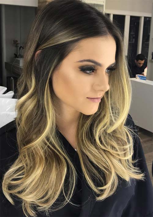 Capture the polished elegance of the jet-set lifestyle with this champagne bronde. A deep brown crown descends into a soft balayage of prosecco blonde and tawny browns. The look is rounded off with an ombre of deeper golden butter blonde. Soft waves create a luxe finish.