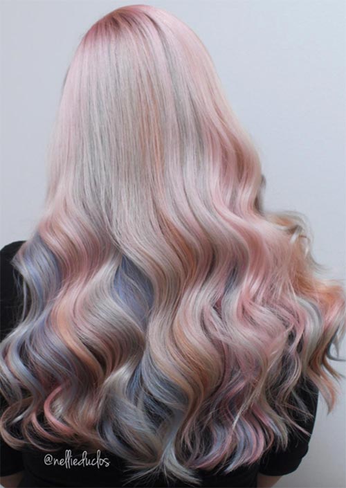 I capelli fantasy sono una tendenza che non si ferma. Adoriamo questo colore dei capelli perla chiaro di luna perché evoca immagini di principesse da favola e creature mitiche. È un approccio sognante ed enigmatico ai colori dei capelli primaverili. Coriandoli leggeri che si sciolgono di blu tenui, rosa, e grigi si traduce in un colore affascinante e delizioso.