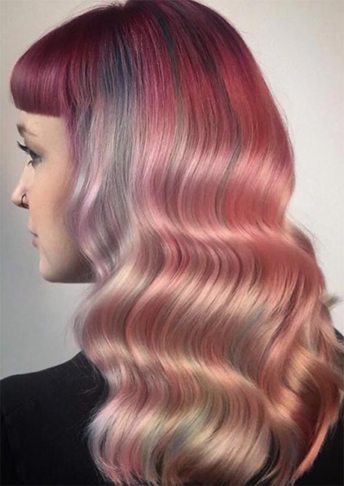Say hello to all the hair colors of the season – it’s like the rainbow wrapped in a bow! Rose gold, amber, lilac, Viola, and golden peach hair shades dance in the winter wind in this edible and dynamic hair look.