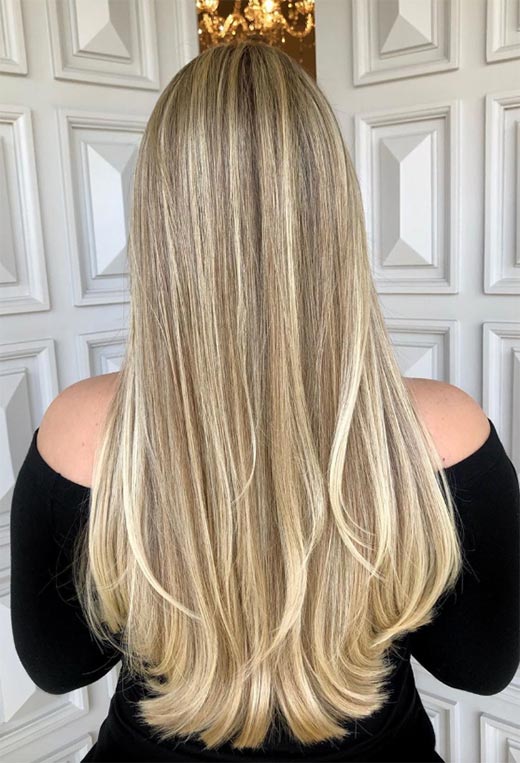 Lo styling arruffato e ondulato è sempre sicuro, ma è quando raddrizzi i capelli che scopri se i tuoi strati lunghi funzionano davvero. Come puoi vedere qui, questi strati biondi luminosi sono minimi e abbastanza sottili da funzionare con qualsiasi stile.