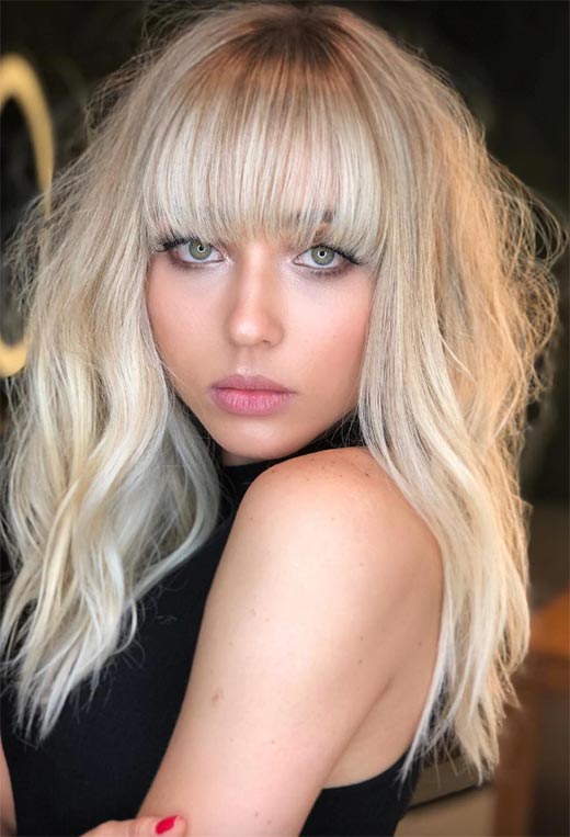 Puoi fare la frangia dritta, insieme a tutti i tipi di strati lunghi:possono essere strati graduali su tutto il viso, oppure puoi optare per una differenza più netta tra le estremità a strati e la frangia.