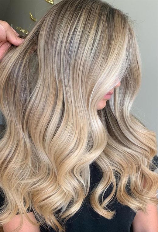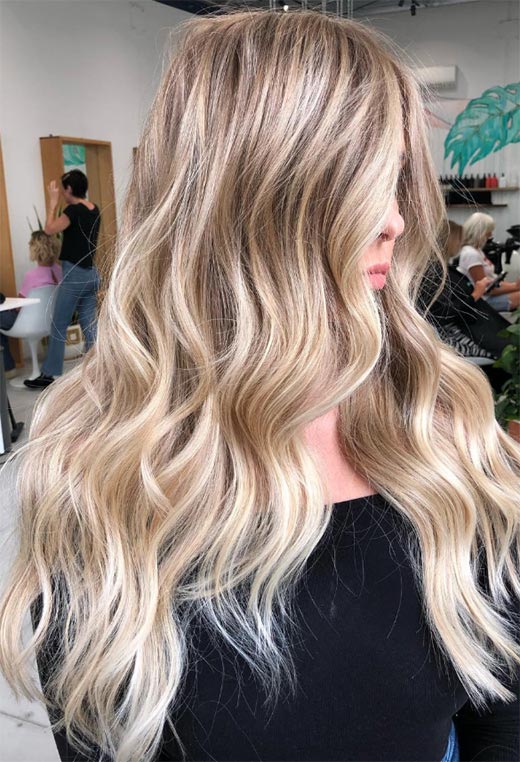 La cascata di strati in questo look attira magnificamente l'attenzione sul viso, agendo come un sipario. Lo stile elegante funziona proprio come farebbero le onde, mentre la miscela di sottile, le luci basse marroni aggiungono una tonnellata di volume al look biondo.