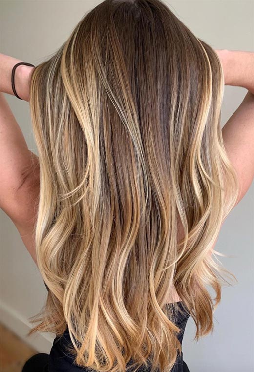 Questa è una di quelle acconciature lucide a strati lunghi che riguardano il volume. Parte del volume deriva dalla variegata stratificazione, che aggiunge volume e forma, and another part of it comes from the extra skinny brown lowlights that up the golden balayage.