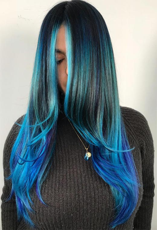 I tagli di capelli lunghi a strati possono essere di tutti i tipi di colori. La stessa stratificazione è un po' instabile, in un lungo, stile graduato che richiama l'attenzione sul viso, con alcune estremità capovolte che ci danno vibrazioni oceaniche. Il balayage verde acqua e blu oceano sulle ciocche nere è drammatico e unico.