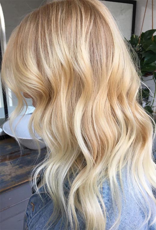 Questi sono lussureggianti, ciocche bionde di cui Rapunzel sarebbe gelosa (in parte perché non può godere di una stratificazione così intelligente). Le onde sono il classico stile bomba, attirando l'attenzione sugli strati piumosi che sono abbastanza vari da aggiungere dimensione pur mantenendo un aspetto naturale e spensierato.