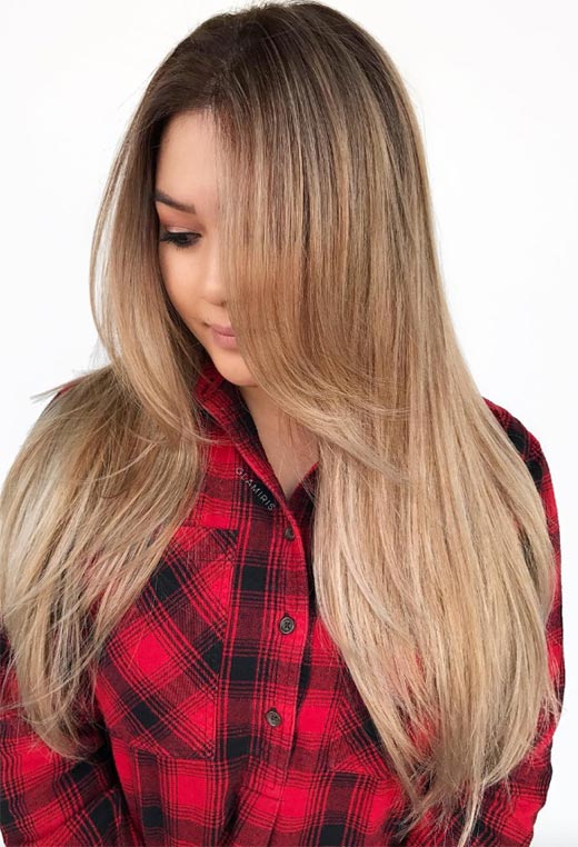 Questo lungo taglio di capelli a strati ci mostra una variazione più sottile su strati lunghi graduati, dove il davanti è un po' più corto ma si allunga progressivamente verso il dietro. Funziona bene con il balayage biondo brillante e rame.