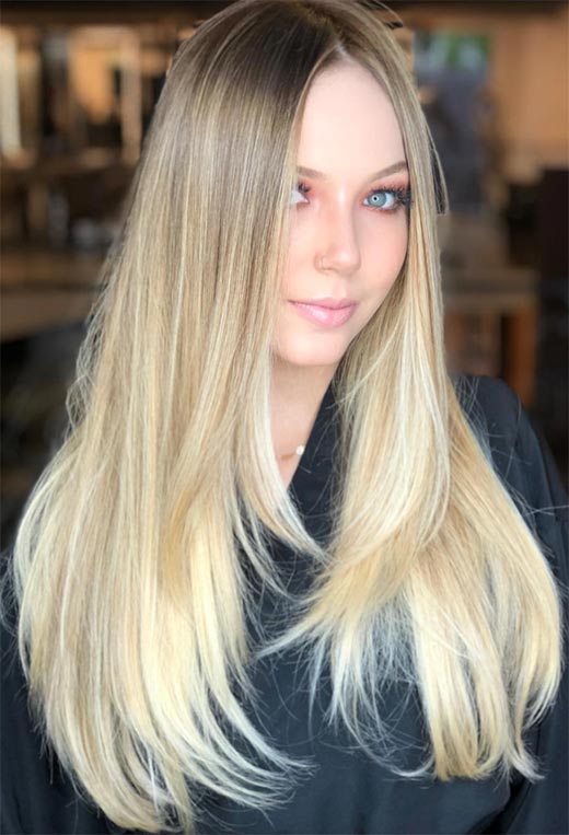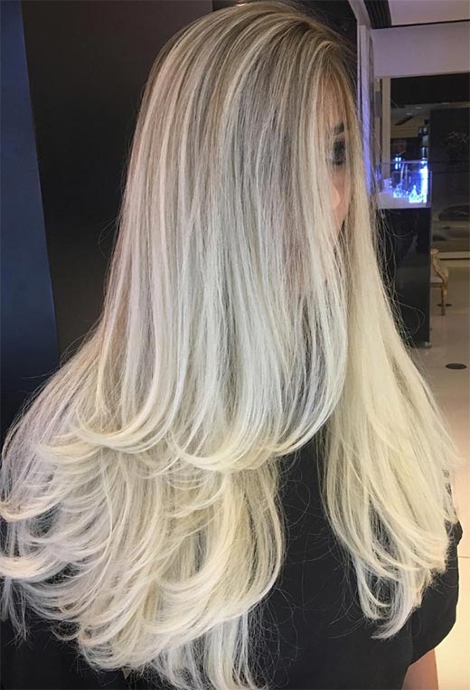 Il modo in cui sono stati stilizzati questi lunghi strati fa sì che questo look dia l'effetto lusinghiero di un lungo taglio di capelli lungo con il dramma dei capelli lunghi, poiché gli strati vicino al viso cadono appena sotto le spalle mentre il resto dei capelli è molto lungo. è un bell'aspetto, completato da un fantastico colormelt biondo.