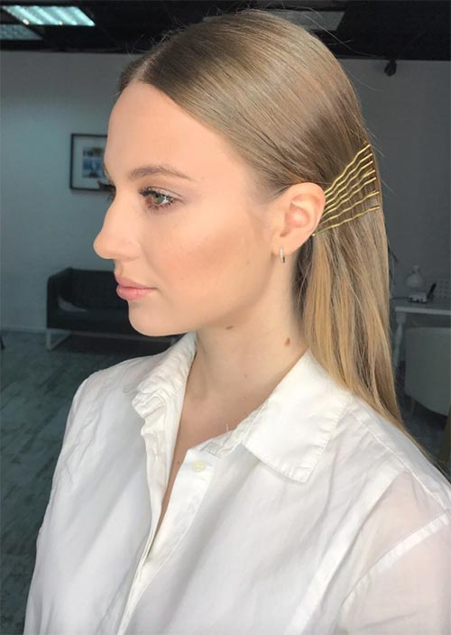 L'aspetto liscio ed elegante è supportato da appuntare i capelli dietro le orecchie con forcine più grandi per essere sicuri che le ciocche di capelli non cadano in avanti. Mantenere i capelli pettinati all'indietro consente di mantenere l'acconciatura a forcina per tutto il giorno.