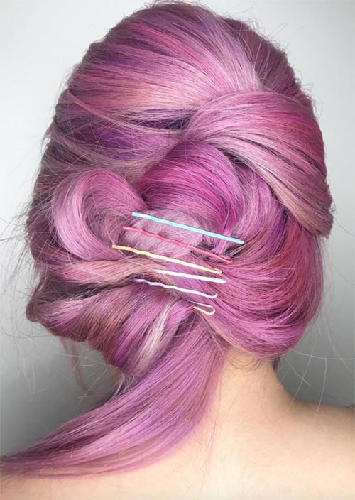 Le forcine dai colori vivaci possono essere utilizzate in modo creativo e funzionano altrettanto bene in molte acconciature diverse come le normali forcine. Eccoli l'accento perfetto per le sfumature sbiadite del viola.