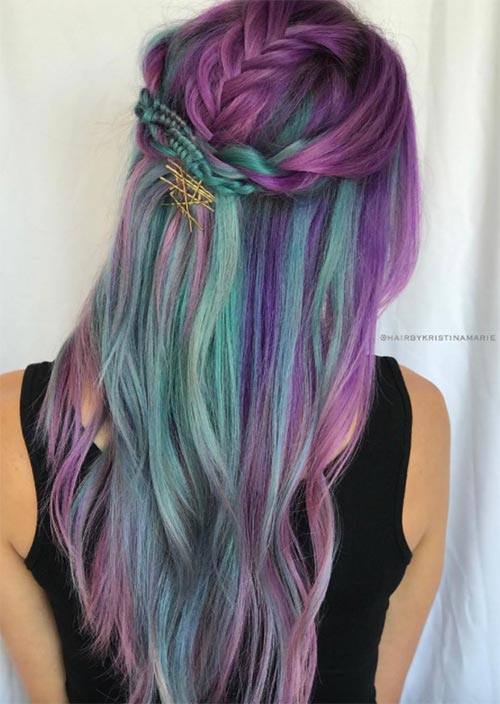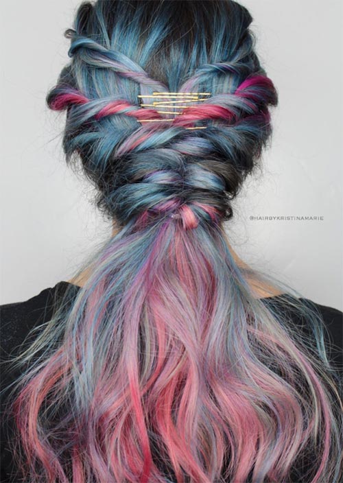 Le code di pesce appuntate insieme a una manciata di forcine dorate creano un aspetto interessante sui capelli colorati prismatici. Questo è un romantico, acconciatura boho-chic con forcina a vista, perfetto da indossare dal giorno alla sera!