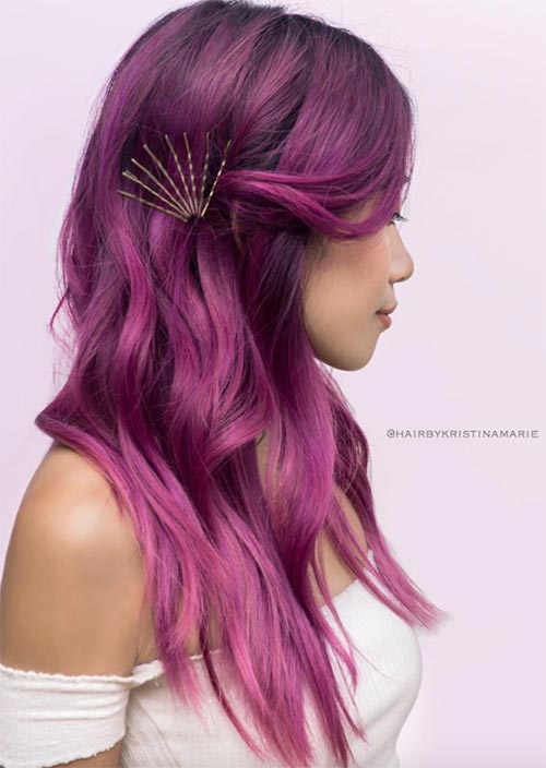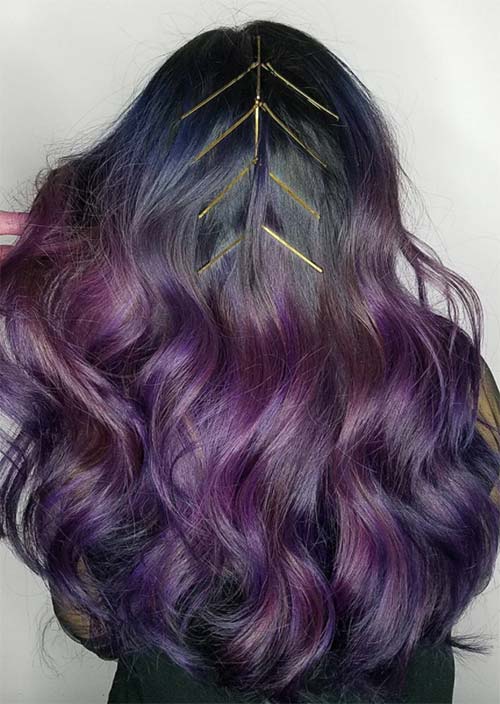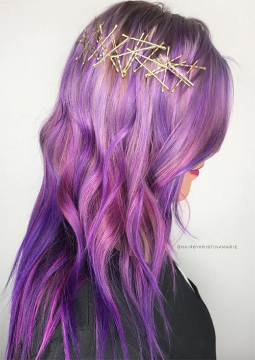 La parte centrale di questi lunghi capelli viola è accentuata da un design semplice di forcine più grandi. A differenza del modo in cui vengono normalmente utilizzate le forcine, qui, i capelli scorreranno ancora, e il design si muoverà con esso.