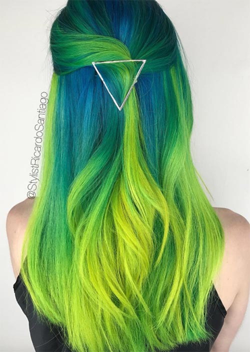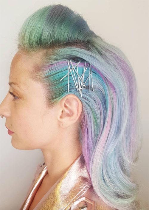 Forcine e capelli al tramonto prismatici significano che qualsiasi piccola torsione o spilla rivelerà più colori come mostrato perfettamente qui. Questo è uno dei modi più semplici per usare le forcine a vista sui capelli, che allo stesso tempo sembrano essere drammaticamente carini.