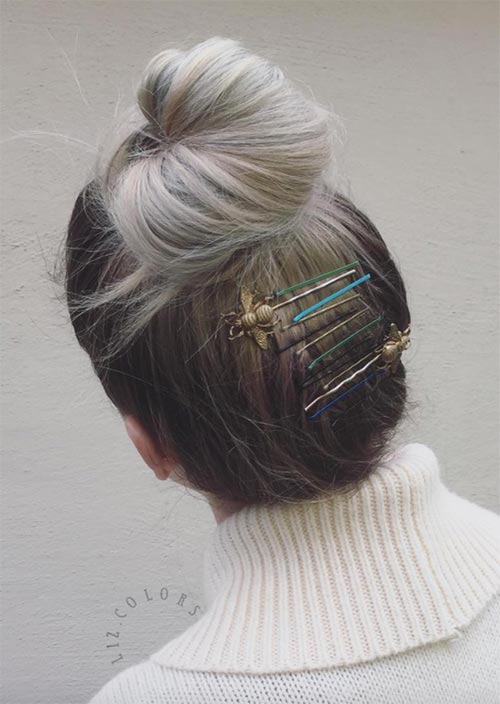 Il colore straordinario funziona magnificamente, mostrando visibilmente una presa sui capelli che in realtà è fatta da spille più piccole di dimensioni regolari. Questo è un perfetto esempio di miscelazione di forcine e utilizzo di spille di design di spicco.
