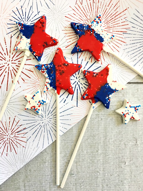 Certo, non devi limitare questi deliziosi pop star al cioccolato solo alle feste patriottiche! Usa altre caramelle fondenti per creare diverse combinazioni di colori per compleanni e altre feste!
