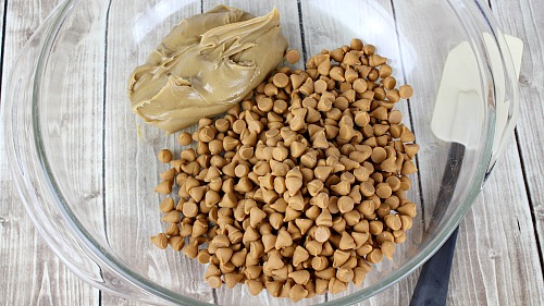 2. Aggiungi le patatine al caramello e il burro di arachidi in una ciotola adatta al microonde. Microonde in incrementi di 30 secondi fino a quando non si scioglie e diventa liscio.