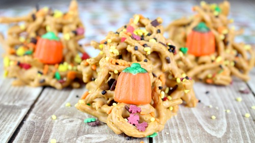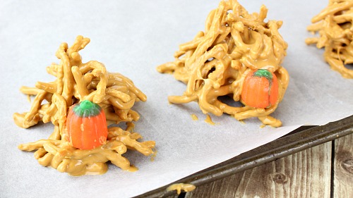 Ho anche sentito di persone che li servono a Natale (per rappresentare il fieno nella mangiatoia di Gesù). Per rendere questi Natale amichevoli, basta sostituire le codette di foglie con le codette colorate di Natale e scambiare le zucche con i mini marshmallow. Veramente, con un po' di creatività puoi personalizzare questo pagliaio chow mein candy per qualsiasi periodo dell'anno!