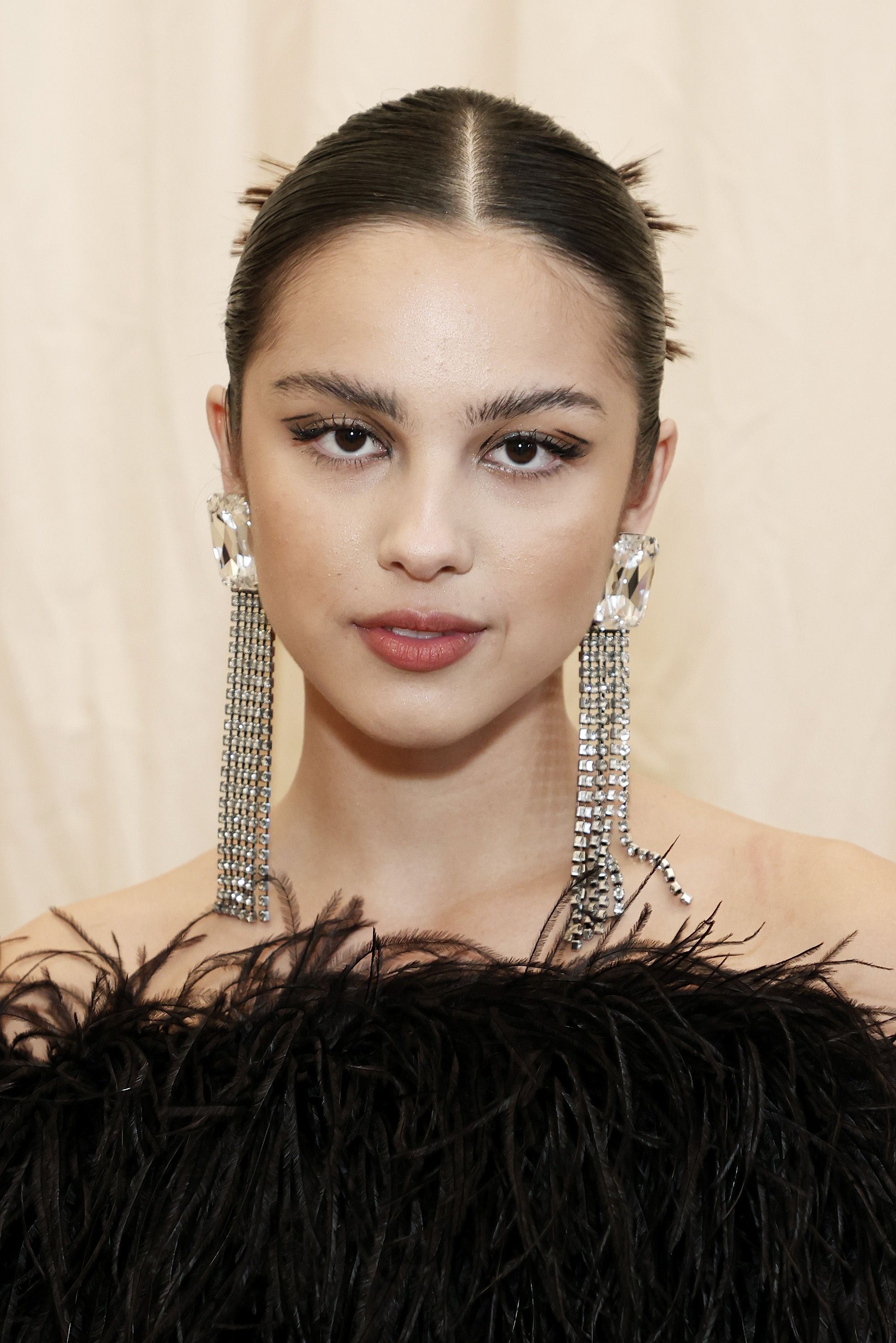 12 O elegante puxado para trás de Olivia Rodrigo p A própria Gen Z Queen foi toda elegância no 2021 Met Gala. Seu cabelo estava completamente puxado para trás em um coque espetado, tornando seu rosto a estrela do show.